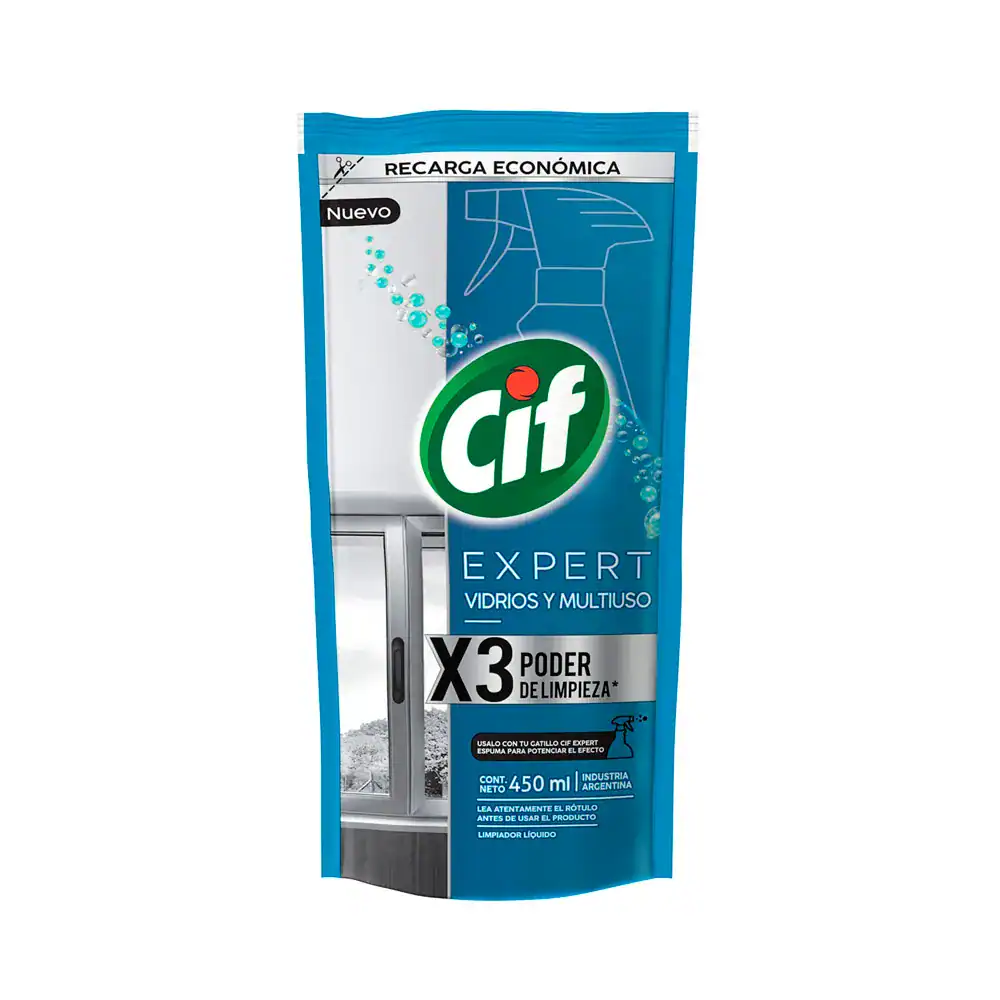 Cif Limpiador Vidrios y Multiuso 450 ml en formato doypack es el repuesto ideal para rellenar envases con gatillo, ofreciendo una fórmula diseñada para dejar vidrios, espejos y superficies lisas impecables y sin vetas.