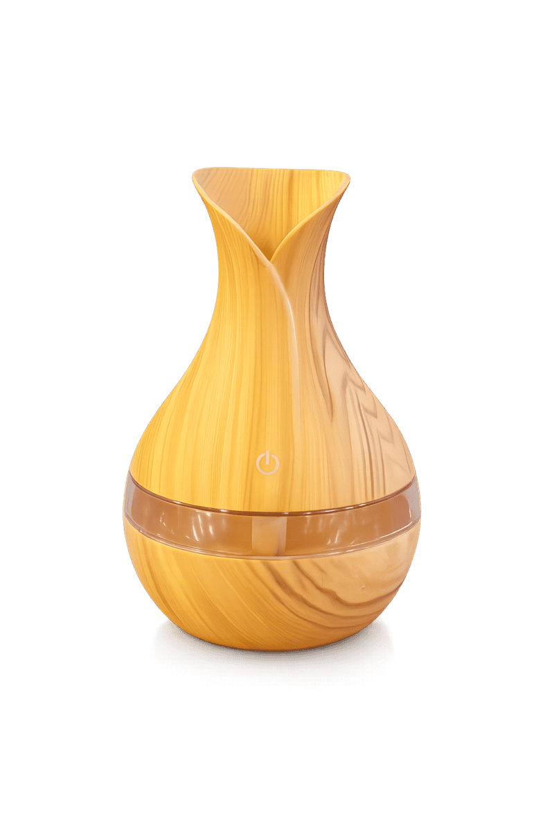 Humidificador con diseño de jarron color madera, ideal para aromatizar y mejorar la calidad del aire en cualquier ambiente.